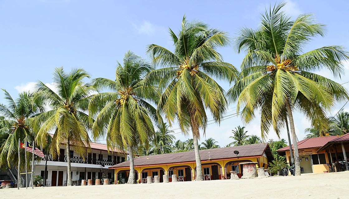 We continued to cycle along, through the shore, in this sleepy island town with only a few cars frequenting our sight, and made our way to 2. Faridzuan Motel Che Hamid, which has 20 rooms available for lodging. Rates start at RM80 to RM90 per room. This motel is built right in front of the beach, and we appreciated not only the smell of the sea air and the sound of the overlapping waves, but also the scenic seaside view jazzed up with the coconut trees lined horizontally close by, as if inviting us out to see them up close amidst the blue expanse.