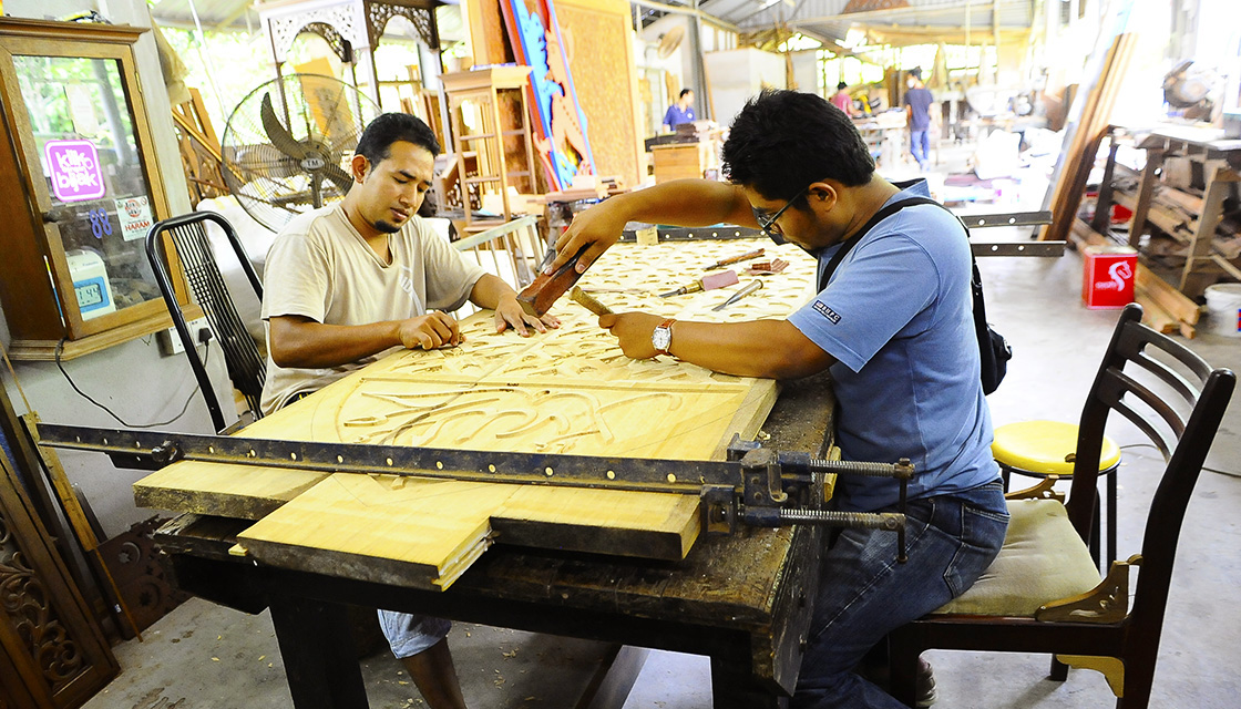 The journey continued for roughly another 2km where we cycled on the open road surrounded by the scenic greenery to our next destination, A. Rahman Kayu Kraf, a 4) woodcarving house established by a 26-year-old wood carver by the name of Abdul Rahman bin Yusoff. The entire space was filled with intricate wood details and it seemed almost surreal to witness the dexterity of this man in woodcarving, seeing him carve his passion into gorgeous crafts. Woods such as merawan, meranti, jelutong and chengalare are highly used for woodcarving. We found out that chengal is the most expensive wood.