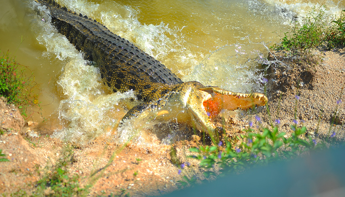 We rode to an enclosed lake nearby for 5. Crocodile feeding. Paya Indah Wetlands maintains the population of the Buaya Tembaga (Crocodylus Porosus) at 38. Crocodile eggs are harvested, and newborns are sent to zoos and crocodile farms to avoid over-crowding. Crocodiles are fed only once a week during the morning of weekends. This is a once-in-a-lifetime experience to see crocodiles emerged from the calmed lake one after another as the wetlands keeper whistled to signal that it’s already feeding time.