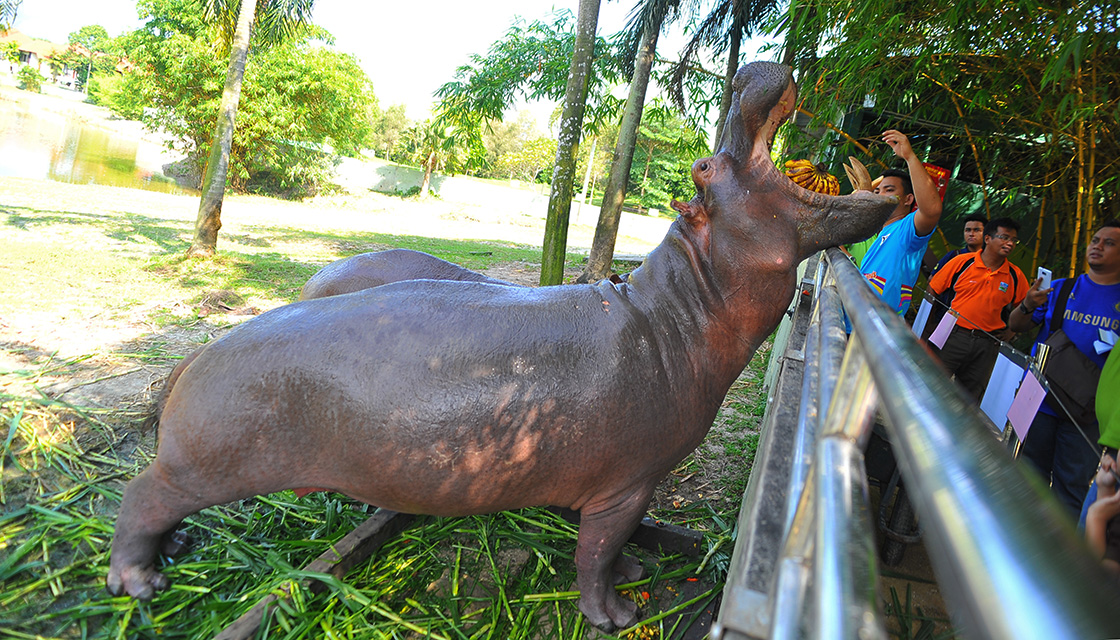 Taking a U-turn from ‘Rentis Typha’, we entered the educational zone for 4. Hippopotamuses feeding. Both adults and children would be amazed by seeing the hippos up-close. The Botswana hippos (a four-ton male, Kundra, and two 3.5-ton females, Juwita and Cendana) are so huge that they are fed with 70kg of papayas, Napier and Cow grass every day. The third largest land mammal by weight stays in water or mud during the day to keep cool; even reproduction and childbirth occur in water.