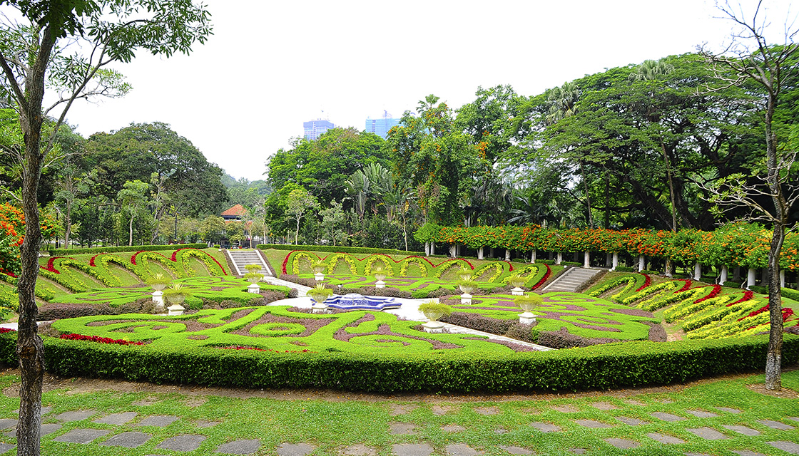 Designed basically as two concentric plazas surrounded by Taman Putra Perdana, the circular ceremonial area is an open landscape encircled by Chahar Baghs, which acts as a transition between the parks and the ceremonial area. Inside the Chahar Baghs is an intricately arranged interplay of paths, water channels, flower beds and trees, while beyond it is a sea of gaily-coloured local flora.