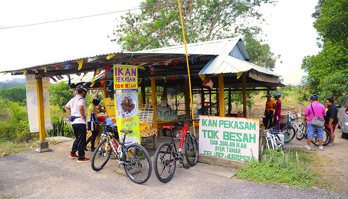 Before we lay dazed by the lake, we got started and cycled 2km on flat road with views of rustic farms on the side to Ikan Pekasam Courtege Stall to delight in some tasty adventure.