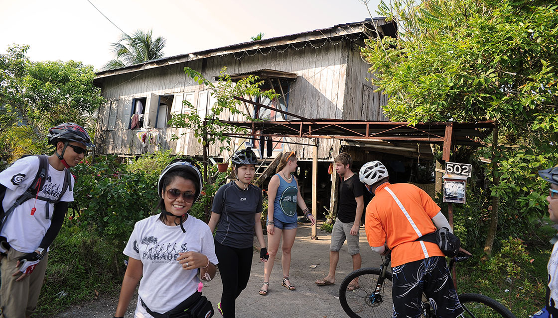 O’er 3 kilometers after, we cycled in single file across a 2. Wooden Bridge, our wheels thumping over planks, bump-bump-bump, down narrower roads with more houses raised on stilts on both sides.